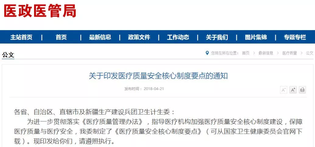 卫健委颁布医疗质量安全制度