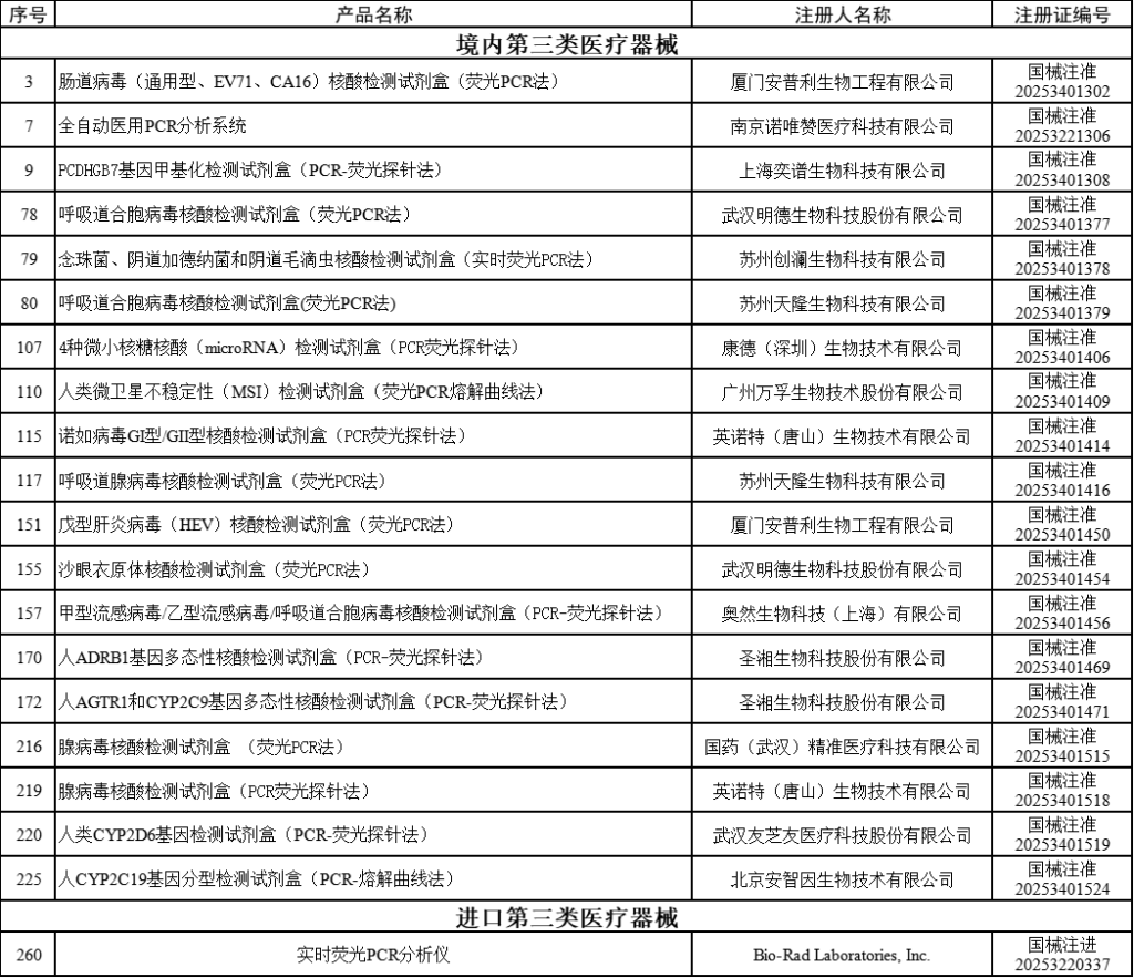 2025年8月19日,国家药监局发布7月共批准注册医疗器械产品295个。其中包含20个核酸/基因检测相关产品,18个为检测试剂盒,2个为PCR分析仪。